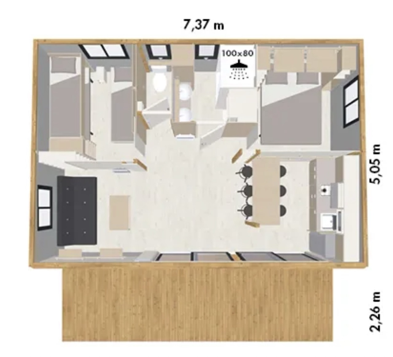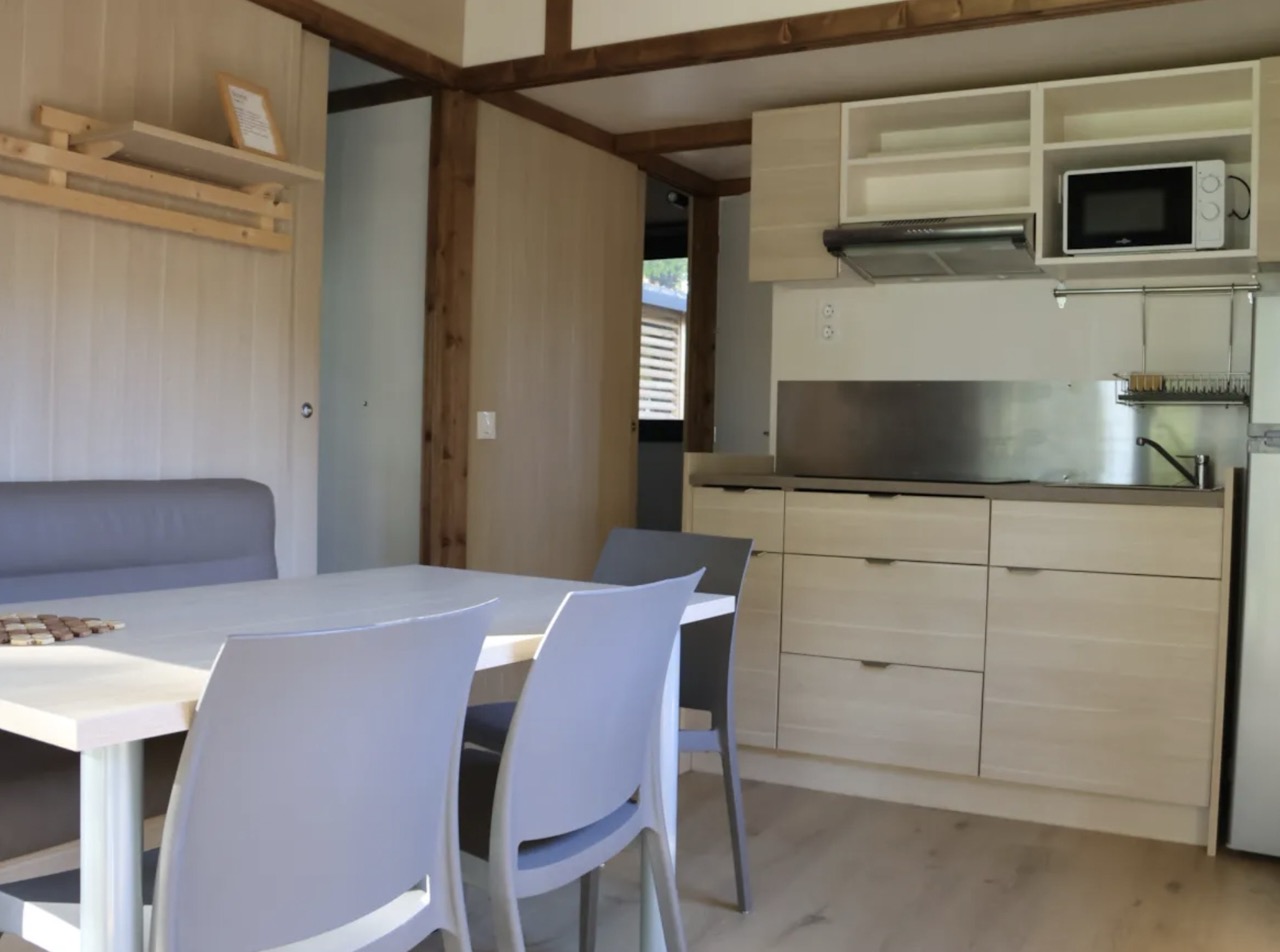 L’éco lodge, construit en bois, offre un intérieur confortable et entièrement équipé. Idéal pour des vacances reposantes en harmonie avec la nature !
